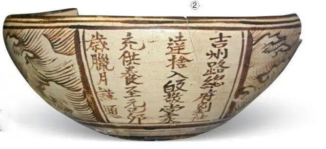 钵内壁绘鸾蝶,腹部以波涛为地纹,开光内书写“吉州路总府刘仕达舍入皈敬堂永充供养,至元己卯岁腊月谨题”。元代有前后两个至元己卯年, 分别为前至元十六年(1279年)和后至元五年(1339年),根据《元史·地理五》记载:“至元十四年,升吉州路总管府,置录事司,另一司、八县。元贞元年(1295年),吉水、安福、太和、永新四县升州,改吉州为吉安路”,可见该钵制作年代只可能为前至元十六年。