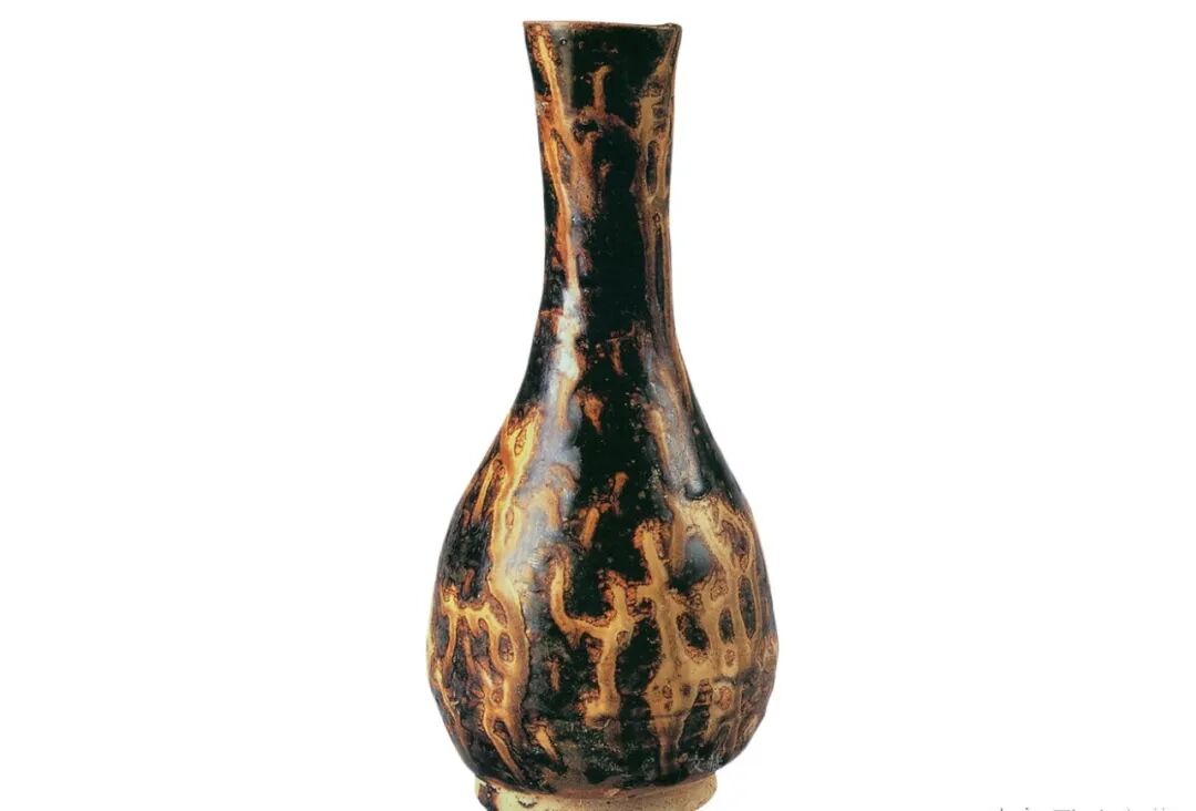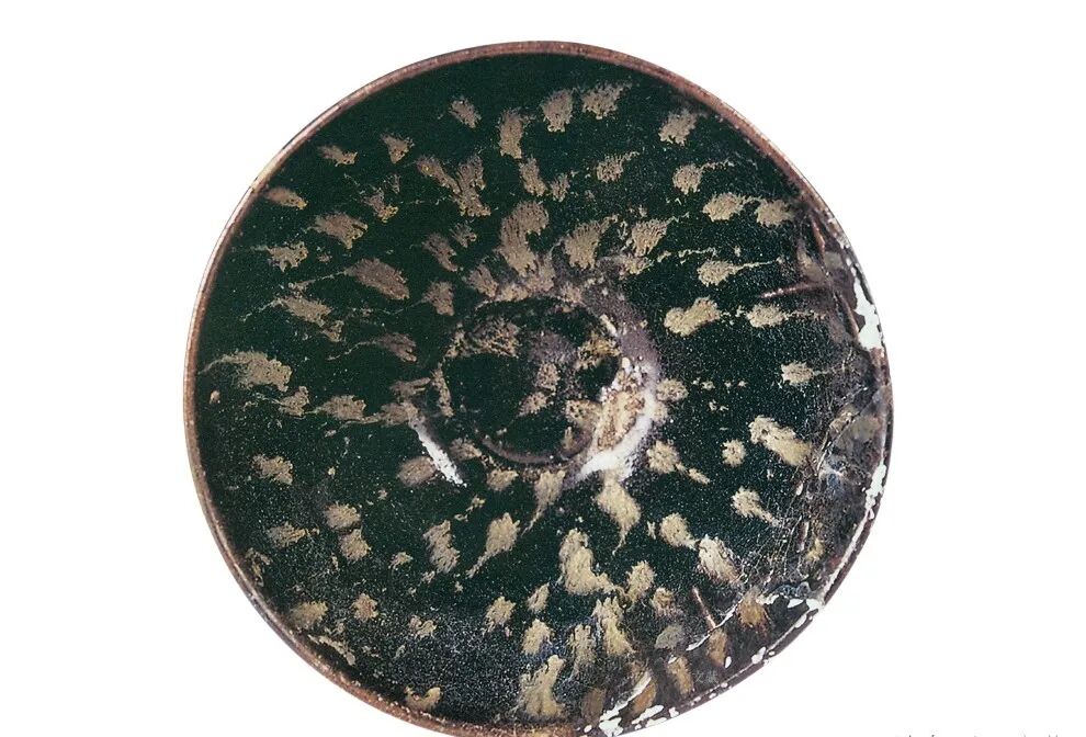 江西省博物馆藏宋黑釉黄斑纹长颈瓶,口径3.9、底颈6.3、高19.7厘米。洒釉、釉斑茶具具有自然灵动之美,装饰风格自然朴素,率性洒脱,虽系人工所为,却透出一般自然造化的禅意之美。洒釉和釉斑装饰技法在南宋吉州窑茶盏等器物上十分流行,其工艺源头似可上溯至北方唐宋黑瓷同类装饰。