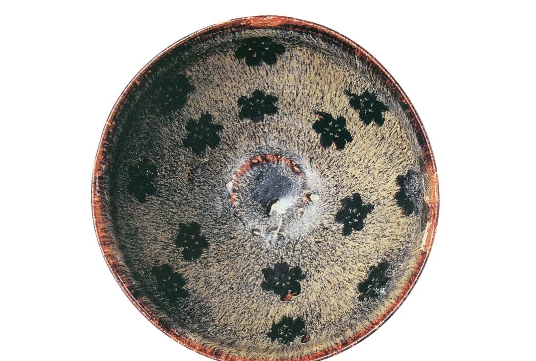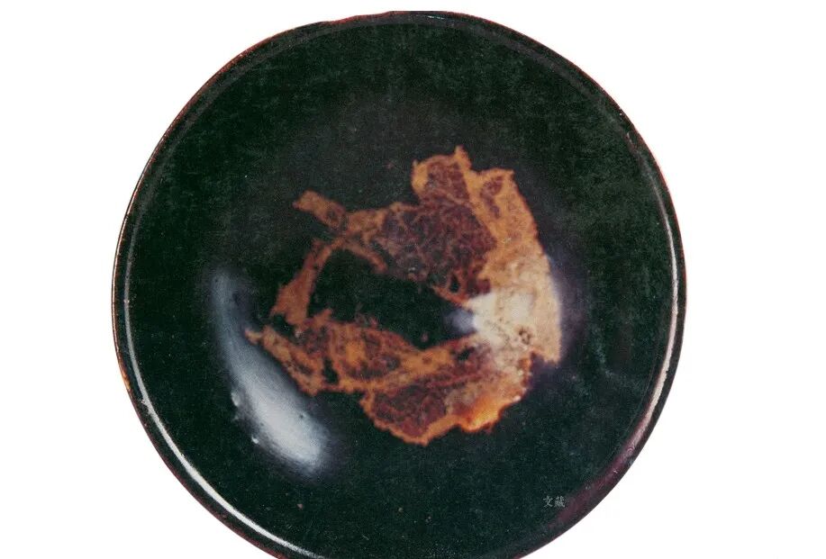 天津市博物馆藏南宋黑釉木叶纹笠式盏,口径11.5、底径3.1、高5.2厘米。木叶纹是指将天然桑叶用于瓷器装饰,烧成后的桑叶呈黄色,与黑色地釉之间形成对比色,树叶的形状,茎脉在黑釉的衬托下清晰可见,妙趣天成。南宋江西派诗人陈与义曾写诗云:“柏树解说法,桑叶能通禅”,因而“能通禅”的桑叶盏很可能就是禅僧或参禅士人所设计。