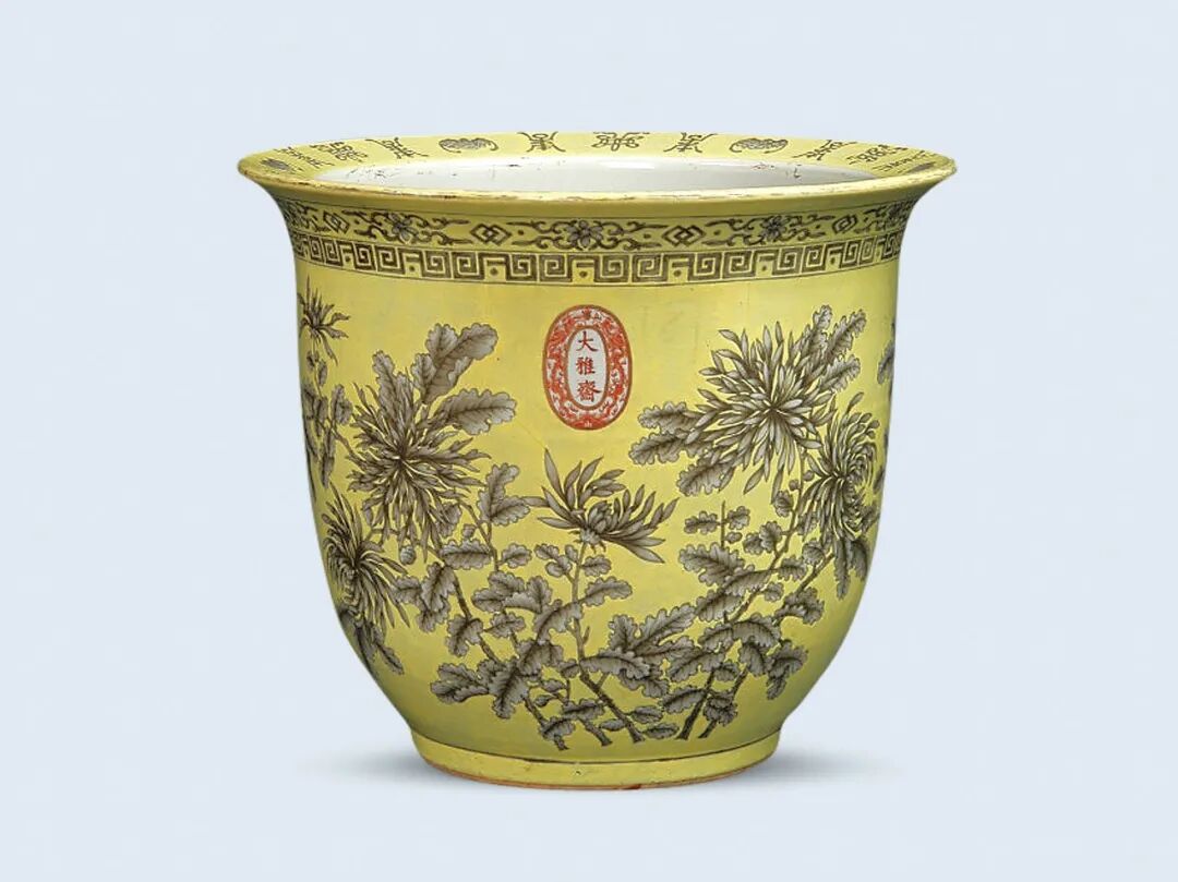 通高33.5、口径39.6、底径21.3厘米。花盆口外撇,深弧腹,圈足。盆里白釉无纹,外壁通体以黄釉为地,口沿处绘蝠寿纹一圈,口沿下饰一圈折枝花卉纹,下接一圈回形纹,腹部黑彩绘秋菊数丛,婉转绽开,秋韵十足。器身有红彩楷书“大雅斋”椭圆形闲章。“大雅斋”是圆明园内的一处建筑名称,位于“天地一家春”之西间,是供慈禧绘画习字的自用画室。“大雅斋”是慈禧的私人堂款,因此,大雅斋瓷器被看作为“大雅斋”画室烧造的慈禧太后专用瓷