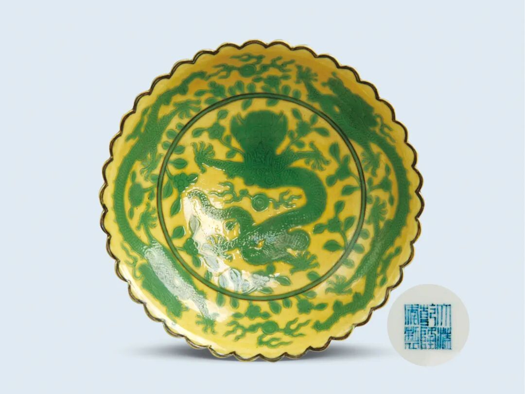 清乾隆 黄釉绿彩云龙纹菊瓣口盘