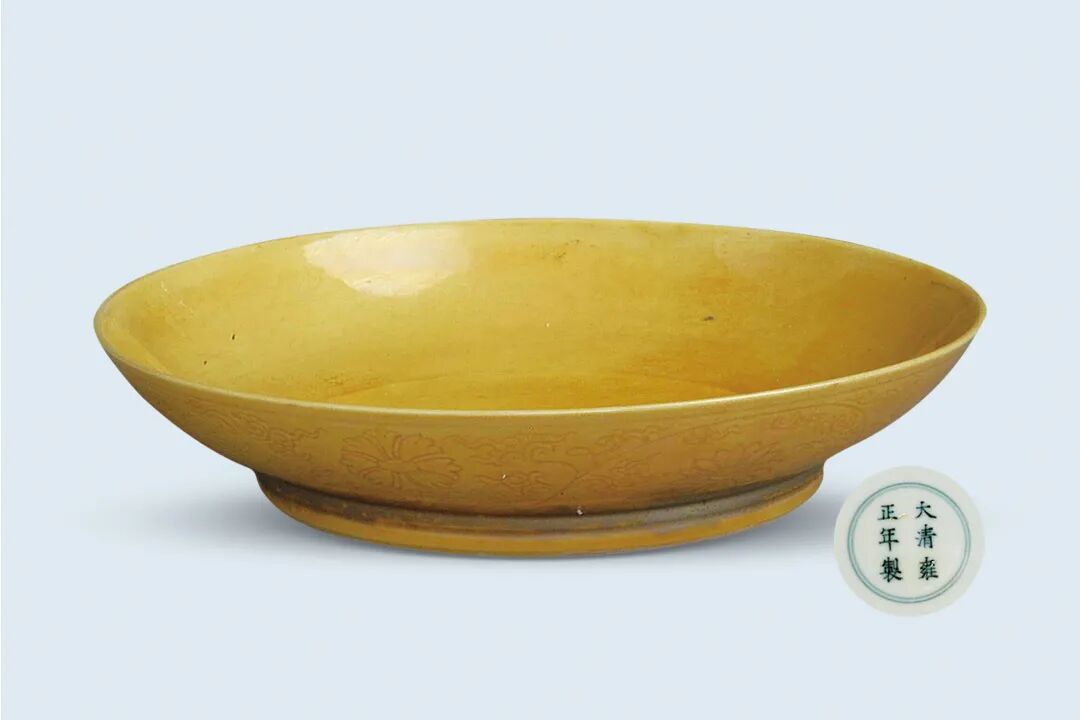 通高3、口径14.6、底径9.5厘米。1980年故宫博物院拨交于新乡市博物馆收藏。盘敞口,弧腹,圈足,器型端庄秀雅,胎质细腻,通体施黄釉,釉色娇艳润泽,内壁素面无纹,外壁暗刻缠枝花卉纹,花朵娇柔灵动,枝叶婉转,纹饰精美。底部施白釉,青花双圈内书“大清雍正年制”6字二行楷书款。