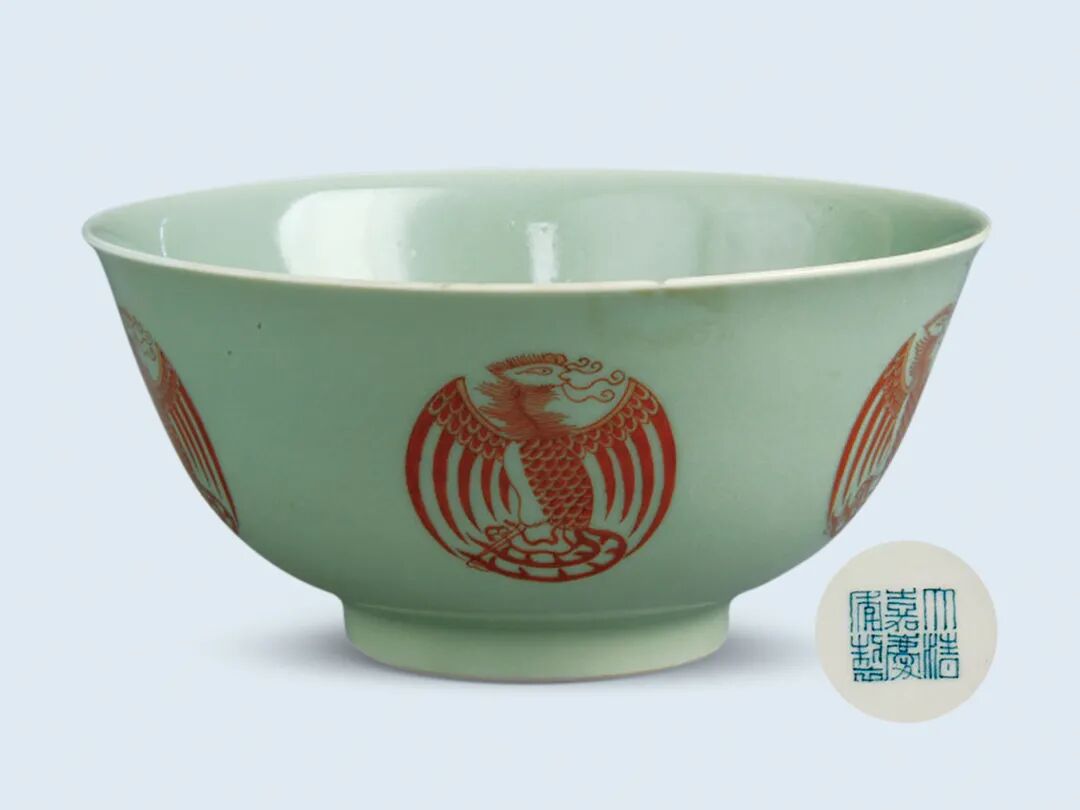 通高6.9、腹径12.6、口径14.5、底径6.3厘米。1980年故宫博物院拨交于新乡市博物馆收藏。碗撇口,弧壁深腹,平底圈足。通体施冬青釉,釉色匀净淡雅。内底、外壁分绘1只和5只矾红彩团凤,团凤以圆形为界,舞动飞转,身姿优美,高贵华丽,极富动感。底书“大清嘉庆年制”6字青花篆书款。凤是神鸟、瑞鸟,百鸟之王,头似锦鸡,身如鸳鸯,翅如大鹏,腿如仙鹤,嘴如鹦鹉,尾如孔雀。团凤纹是凤纹构成的圆形纹样,为清代瓷器流行装饰纹样之一。