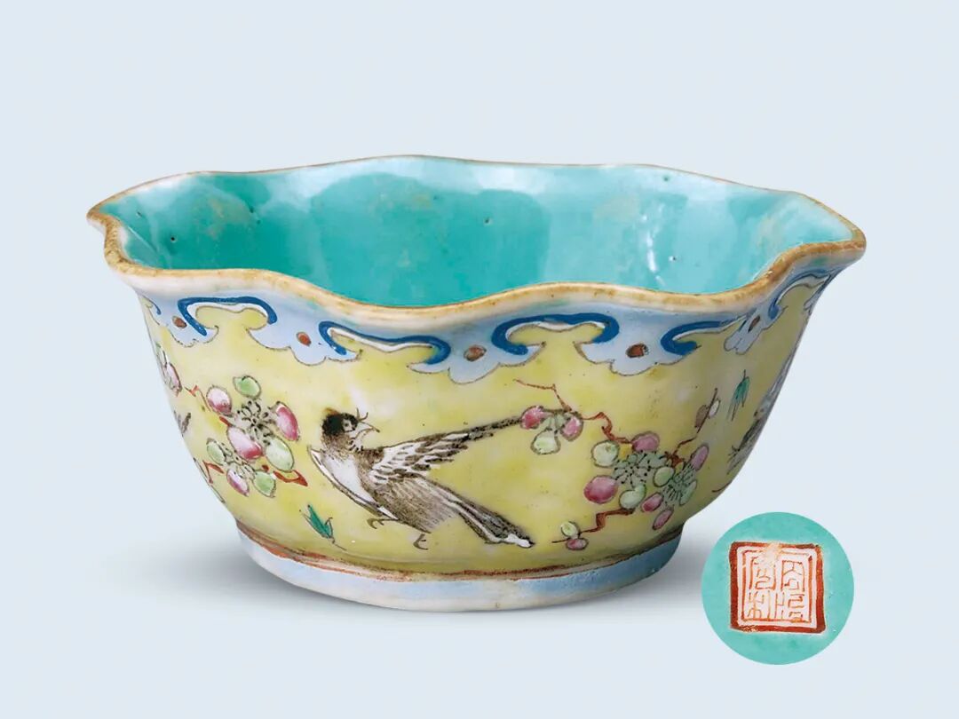 高4.5、底径5.8厘米。此件器物造型精巧别致,花纹口外撇,弧腹,圈足。粉彩,外壁绘制花鸟图,设色丰富。内壁素面无纹饰,施绿彩,粉彩瓷器的内壁及底足内施绿彩,俗称“绿里绿底”,胎体光洁莹润,坚硬缜密。碗底4字篆书款“同治年制”,字体工整,布局谨慎,笔法娟秀,运笔有力。