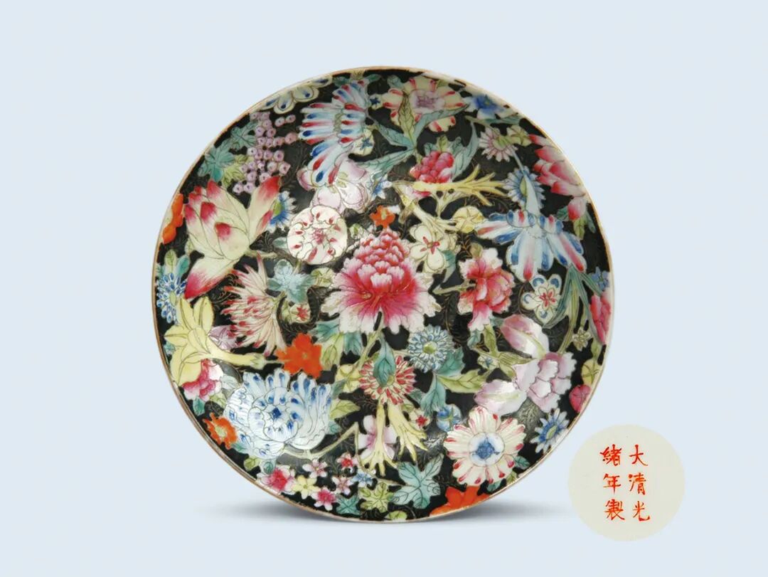 通高2.5、腹径13、口径14.9、底径7.6厘米。盘敞口,浅腹,圈足。盘内绘饰百花图,花团锦簇,绚丽缤纷,以粉彩分别绘月季、牡丹、菊花、牵牛花、百合、荷花等各色花卉及花叶,千姿百态,象征着“百花献瑞”的吉祥之意。外壁对称绘两组粉彩缠枝花卉纹饰。底书“大清光绪年制”6字二行红彩楷书款。百花不露地是瓷器釉上彩的一种表现手法,直观解释就是画上许多花把底子都盖住,使其不露地儿,也叫做“万花锦”“万花堆”“万花献瑞图”等。这是清代工艺繁荣之时才出现的一种装饰纹样,含有“百花献瑞”的美意。