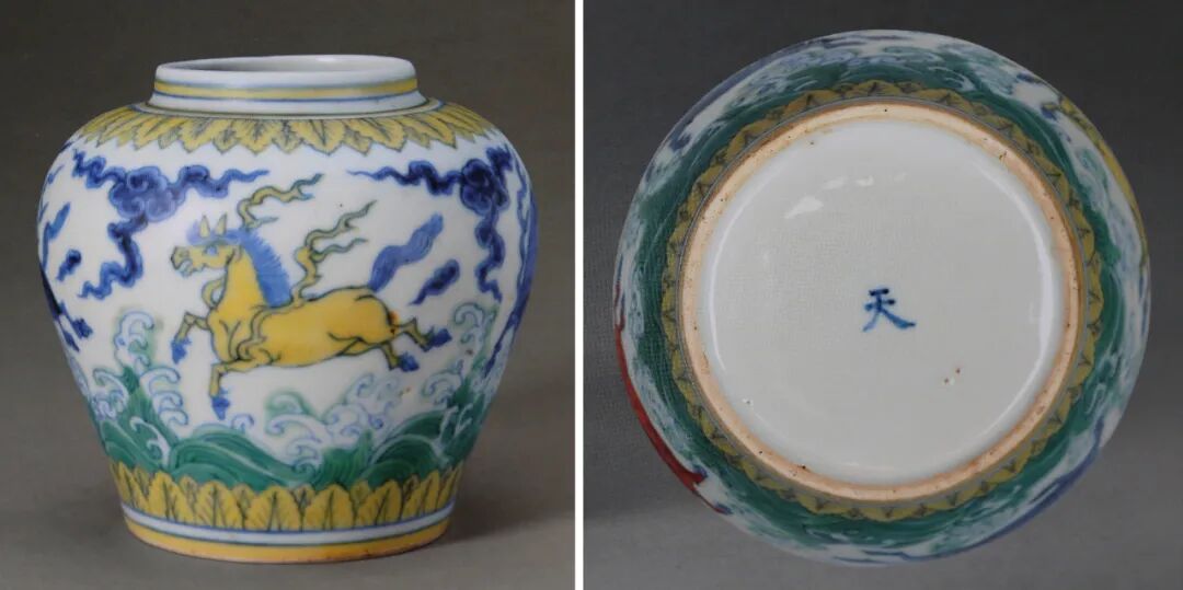 与永乐、宣德朝御窑瓷器所署款识内容不同的是,成化朝御窑瓷器除了署六字年款外,还有一部分斗彩罐之外底中心署青花楷体“天”字款。