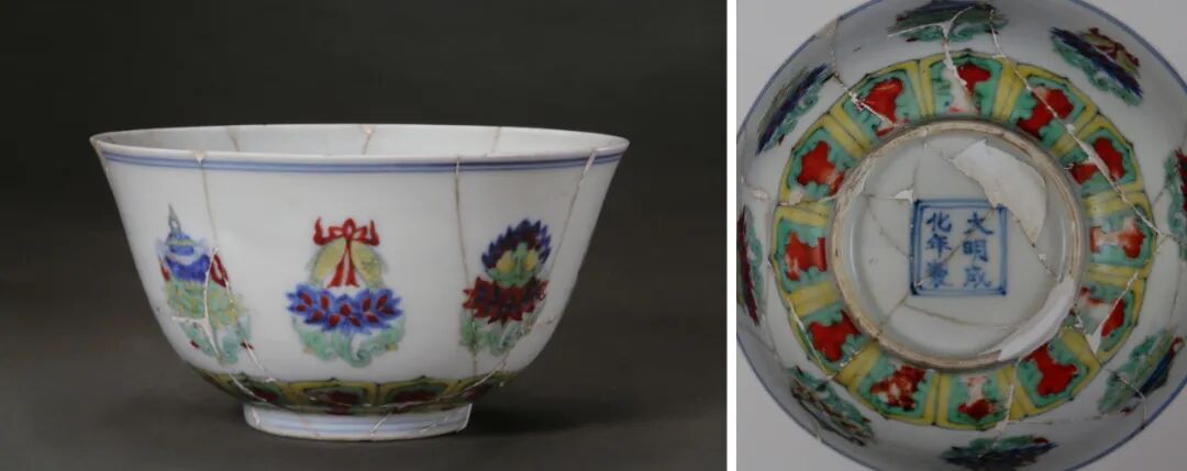 图二十六:明代成化斗彩折枝莲托八吉祥纹碗,景德镇市珠山明代御窑遗址出土