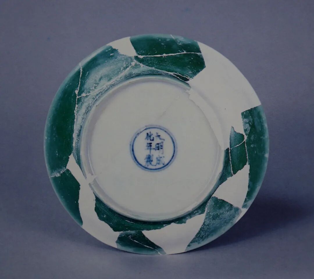 图二十五:明代成化瓜皮绿釉盘(“大”字撇画顿笔,“成”字撇画较软),景德镇市珠山明代御窑遗址出土