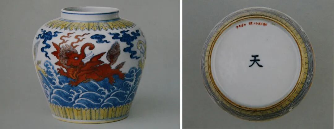 图三十二:清雍正仿成化斗彩海怪纹“天”字罐