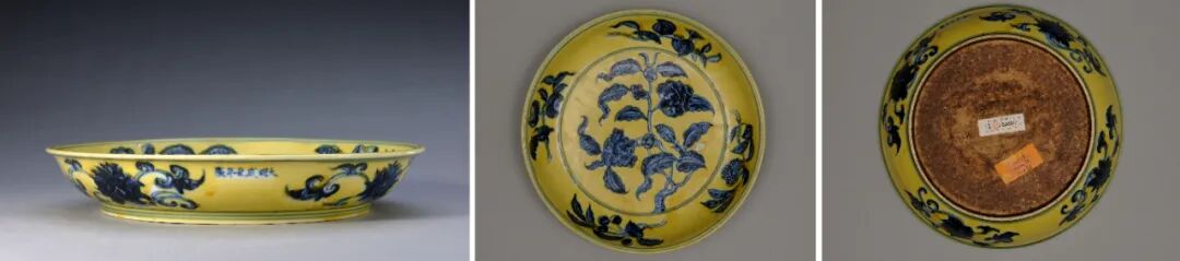 写于口边的如黄地青花折枝花果纹盘和青花麒麟纹盘,这类盘的款识之所以书于口边,是因为其外底无釉,呈糊米色,俗称“糊米底”,无法署款。因此,黄地青花装饰者,即将写款处的黄釉刮掉,留白一条(图二十,1、2、3);白地青花装饰者,即在口边纹饰空白处署款。