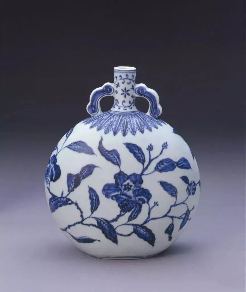 明宣德青花折枝茶花纹如意耳扁壶