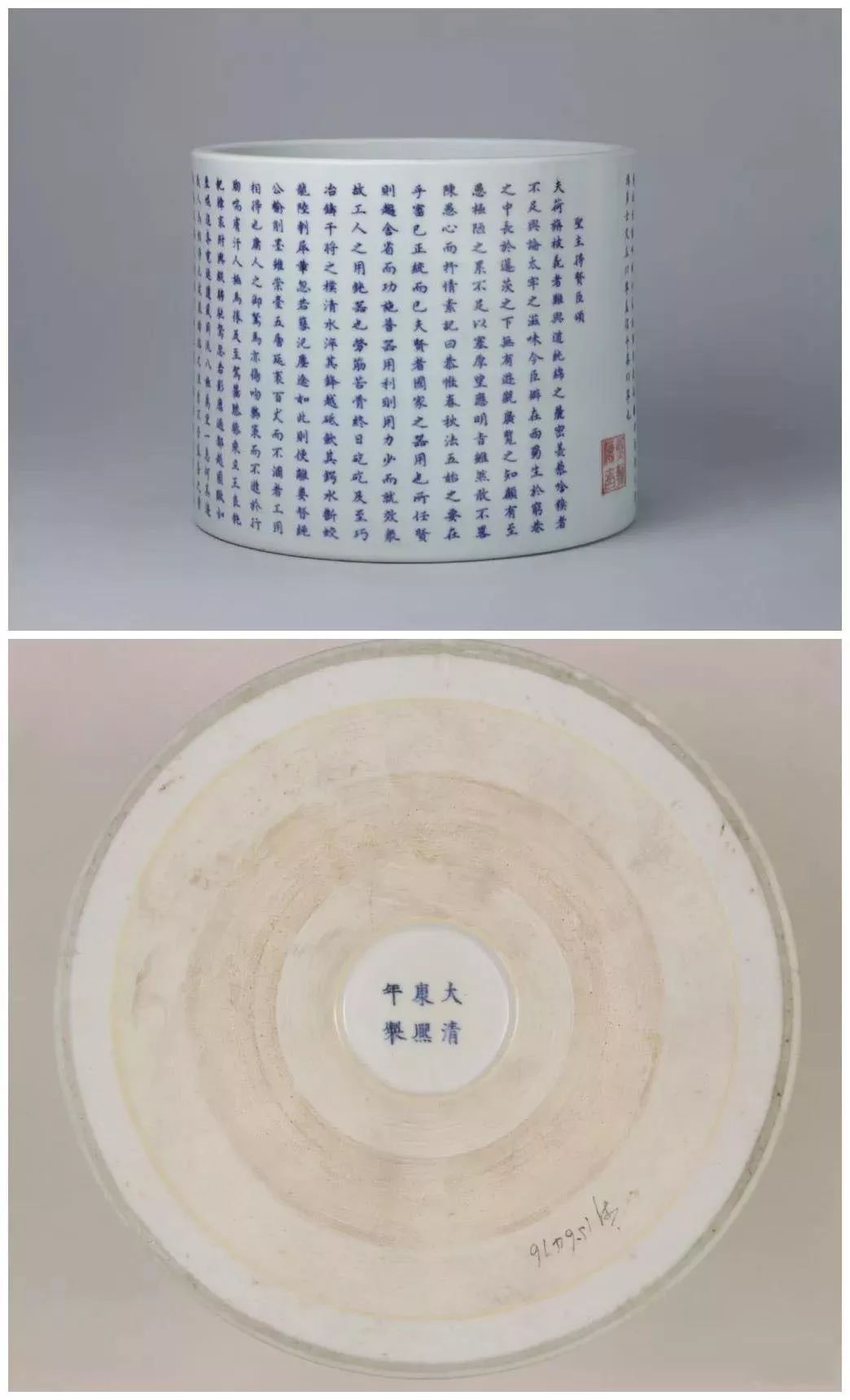 清康熙青花釉里红“圣主得贤臣颂”文笔筒