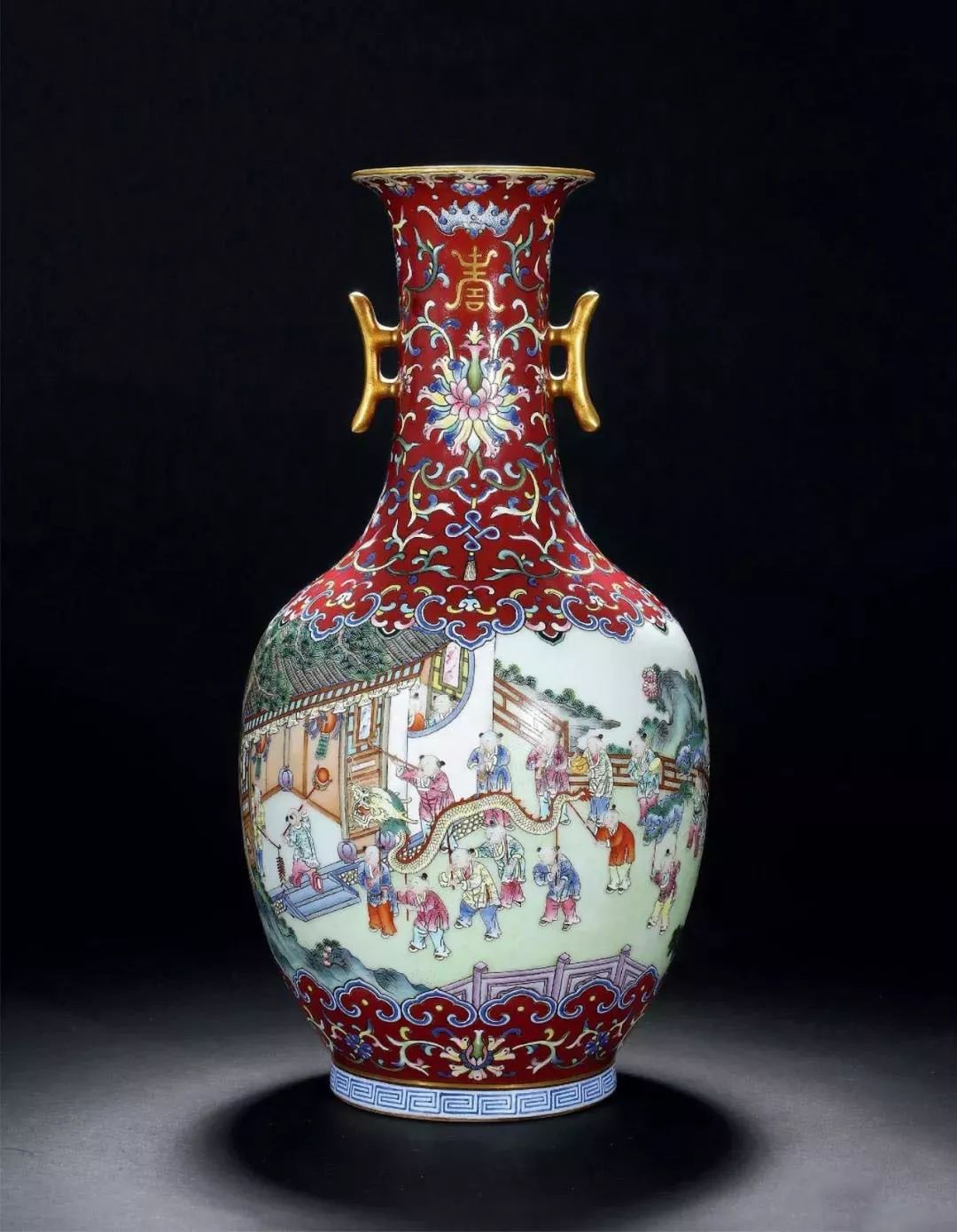 清嘉庆胭脂紫地粉彩开光百子龙灯双戟耳瓶