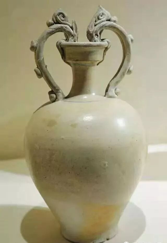 唐代白瓷双龙耳瓶与三彩双龙耳瓶造型相似,系由隋代白瓷双龙耳双连瓶演变而来。