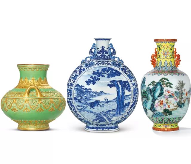 这三件器物均为珍罕非凡的乾隆御窑瓷器,其中清乾隆绿地金彩雕青铜纹双系尊一对以2410万港币成交;