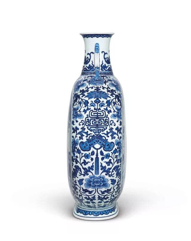 而当晚拍卖的魁首则是清乾隆青花春耕图双福如意耳大抱月瓶,以6985万港币成交。