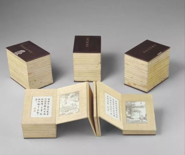 而实际上,整套书以紫檀木制作封面和封底,每片瓷板均如书页一 般镶嵌其中,并以黄色绫绢镶边装裱。