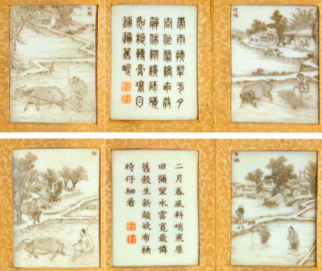 其中最引人注目的是藏于故宫博物院的一套乾隆墨彩书折式御题诗《耕织图》瓷板。
