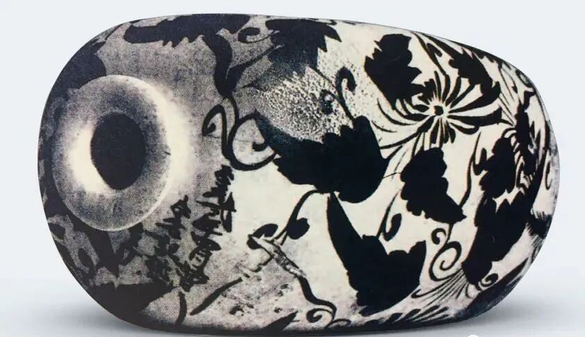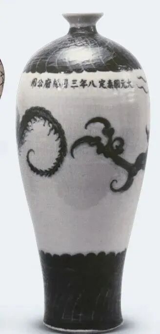 美国波士顿博物馆所藏元代磁州窑“至元二年”款白底黑花花卉纹枕式瓶(下图)。