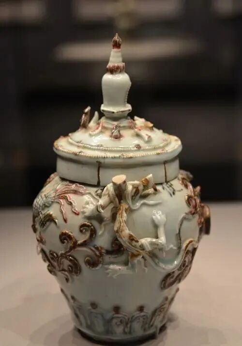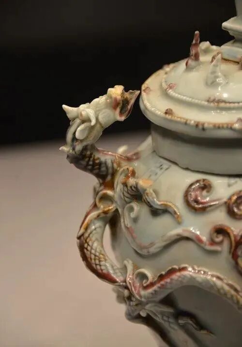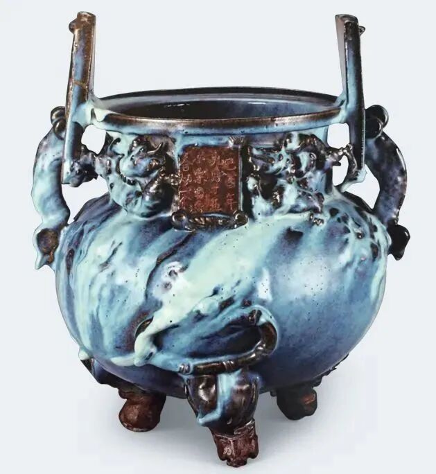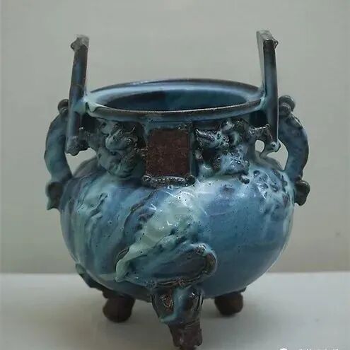 元代钧窑瓷器多为民间日用品。1970 年在内蒙古呼和浩特市郊出土过一件元钧窑天蓝釉贴塑麒麟双耳三足炉(下图)