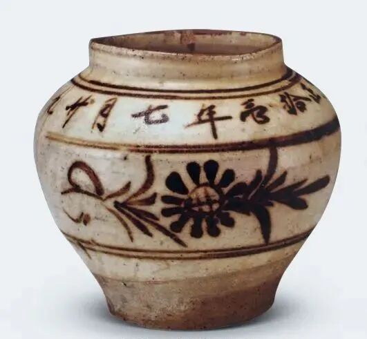 如北京故宫博物院所藏元代磁州窑白地褐花罐(下图),墨书“ 至 正十一年七月十九日小河东陈记造”款;