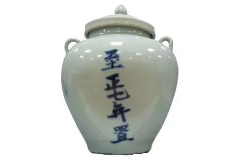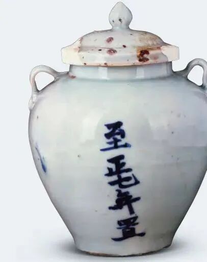 此罐造型古朴端庄,腹部用青花书写“至正七年置”五字,青花色调浓艳,笔意刚健,是研究元代民窑瓷器的重要资料。
