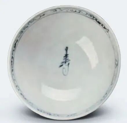 内蒙古包头市文管处所藏元青花飞凤纹“寿”字款高足杯(下图),在杯内心草书一“寿”字。