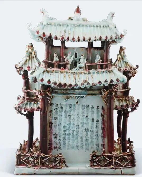 另一件为元青花釉里红堆塑人物楼阁式谷仓(如下图)此物屋身为中央板状箱式结构,面门活动可拆卸,四周门廊微塑各种舞蹈、奏乐、侍卫俑共 18 尊,背面仓板上青花书写 159 字墓志铭一篇,内有纪年铭文:“夫人生于前至元癸巳年二月初九日戌时,殁于后至元戊寅五月二十三日申时,享寿四十六岁。以戊寅六月壬寅之吉安葬于南山。”