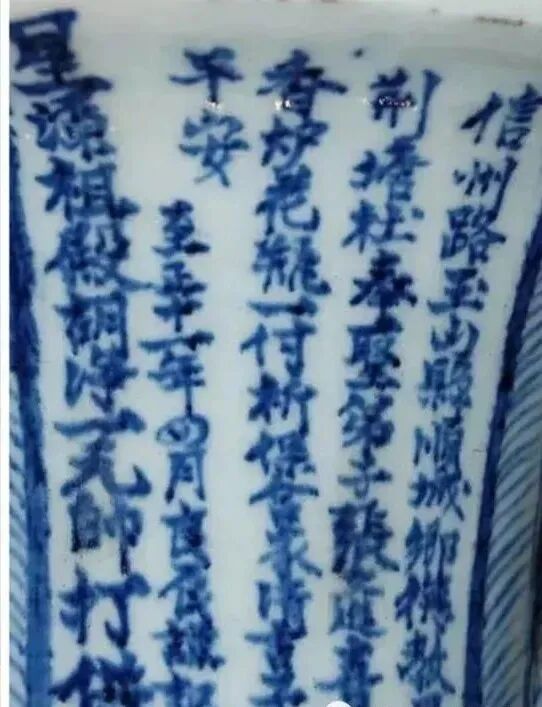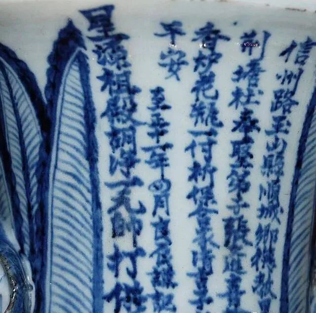 就目前掌握的实物资料来看,元青花大件器中带有纪年款的器物暂见有两件,就是英国大维德基金会所藏的一对元青花云龙纹象耳瓶,上书青花铭文 62 字:“信州路玉山县顺城乡德教里荆塘社,奉圣弟子张文进,喜舍香炉花瓶一副,祈保合家清吉,子女平安。至正十一年四月良辰谨记。星源祖殿,胡净一元帅打供。”铭文字迹清晰,青花色调浓艳,为元青花典型器。