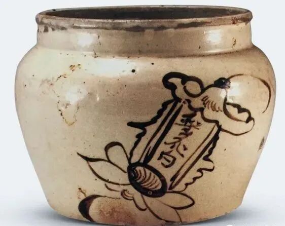 元代磁州窑用黑彩描绘的商品标记很独特,此类款识多用于酒罐或酒瓶,工匠用简练流畅的线条绘出一个长方形框,框上边覆盖一片荷叶,下边托一朵莲花,框内写上品名。