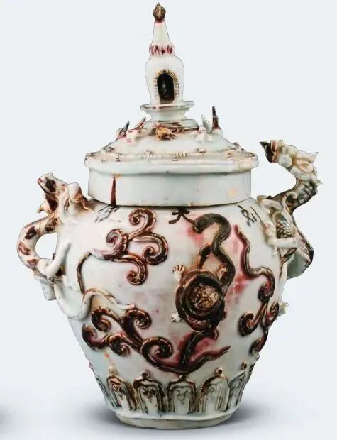 元青花釉里红堆塑四灵塔式盖罐