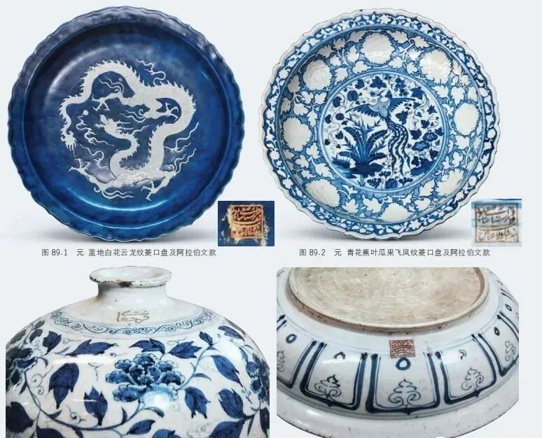 4. 伊朗国家博物馆所藏元青花器、元蓝釉白龙盘或元龙泉窑器的近底处、盘沿下都有阿拉伯文的标记,此标记呈现的形式不一,有的是长方形的戳印状,有的是用青花书写的文字,有的是用工具镌刻再涂以红彩(下图)。