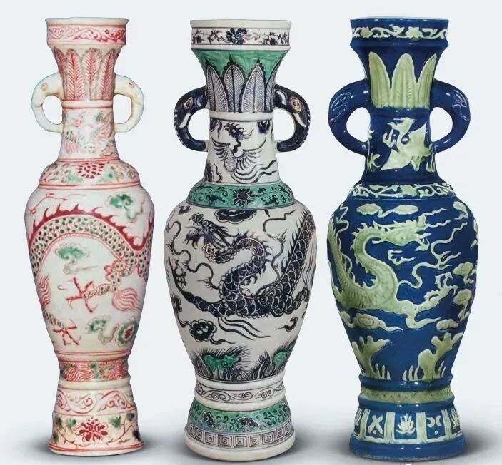 有些作伪者为了误导藏家,将仿品铭文故意改为“至正八年”或“至正九年”等,有的作伪者甚至臆造五彩或青花加彩云龙纹象耳瓶(如下图)其制作粗糙,胎体厚重,纹饰笨拙。