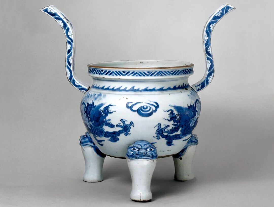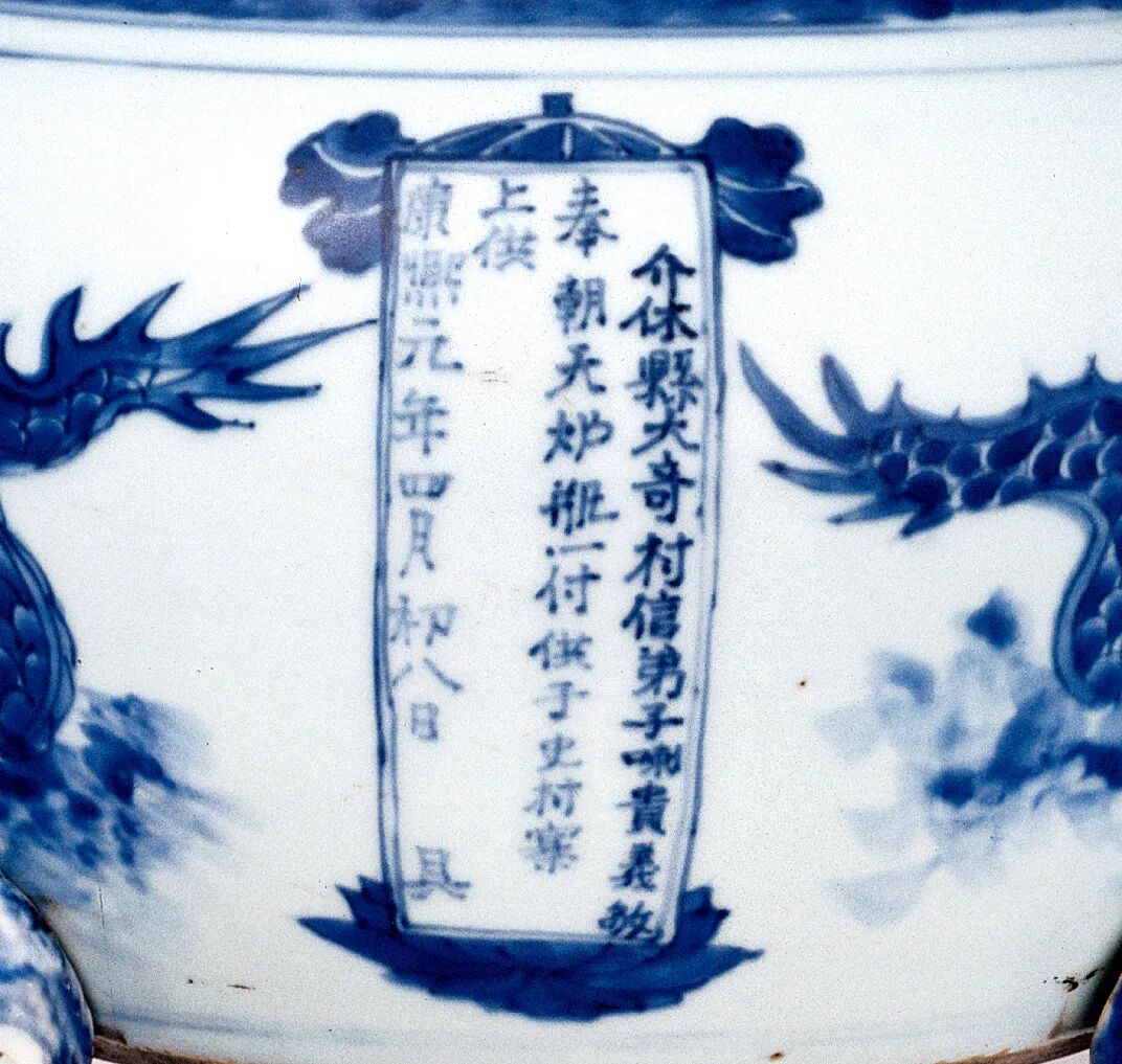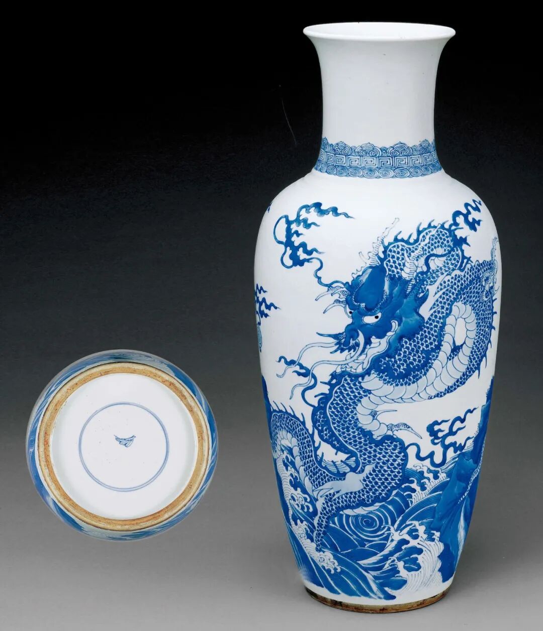 鉴定方面,先要看其胎质是不是足够致密紧凑,露胎处有无「糯米汁」现象。康熙青花瓷器的胎体有足够的坚硬度,因为只有胎体有足够的硬度,在拉坯成型后才会使器物整体有挺拔向上的感觉。
