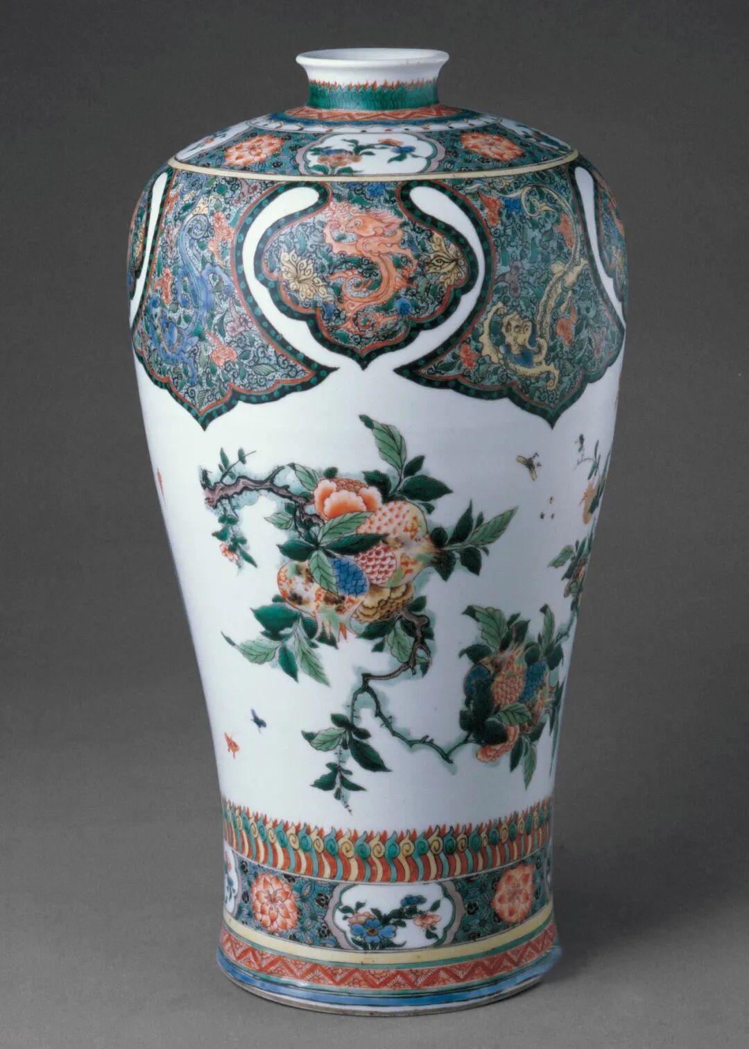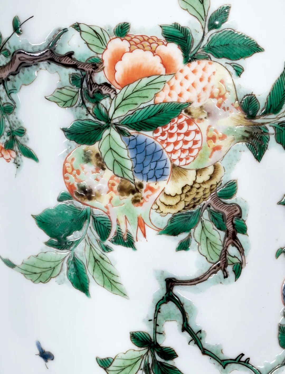 康熙五彩不再用青花替代蓝彩,其颜色含红、黄、紫、绿、蓝、墨、金等多种,各种颜色都反映出鲜明的时代特色: