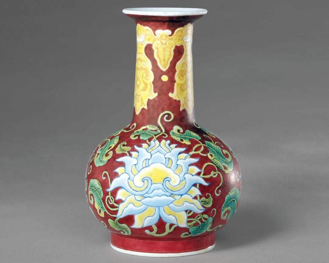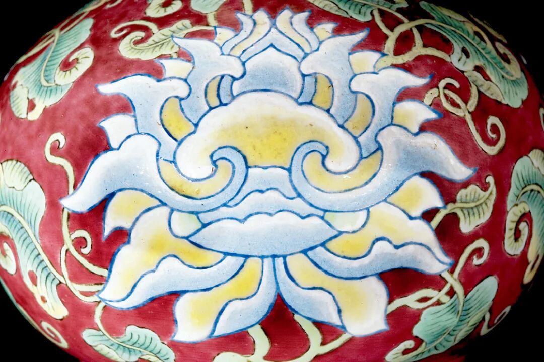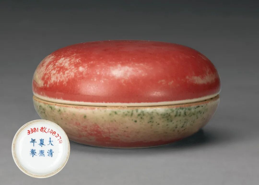 红彩,比明代的枣皮红更鲜艳,表面多见「蛤蜊光」(瓷器表面产生彩色膜状物,类似蛤蜊壳里闪烁的「彩光」)。