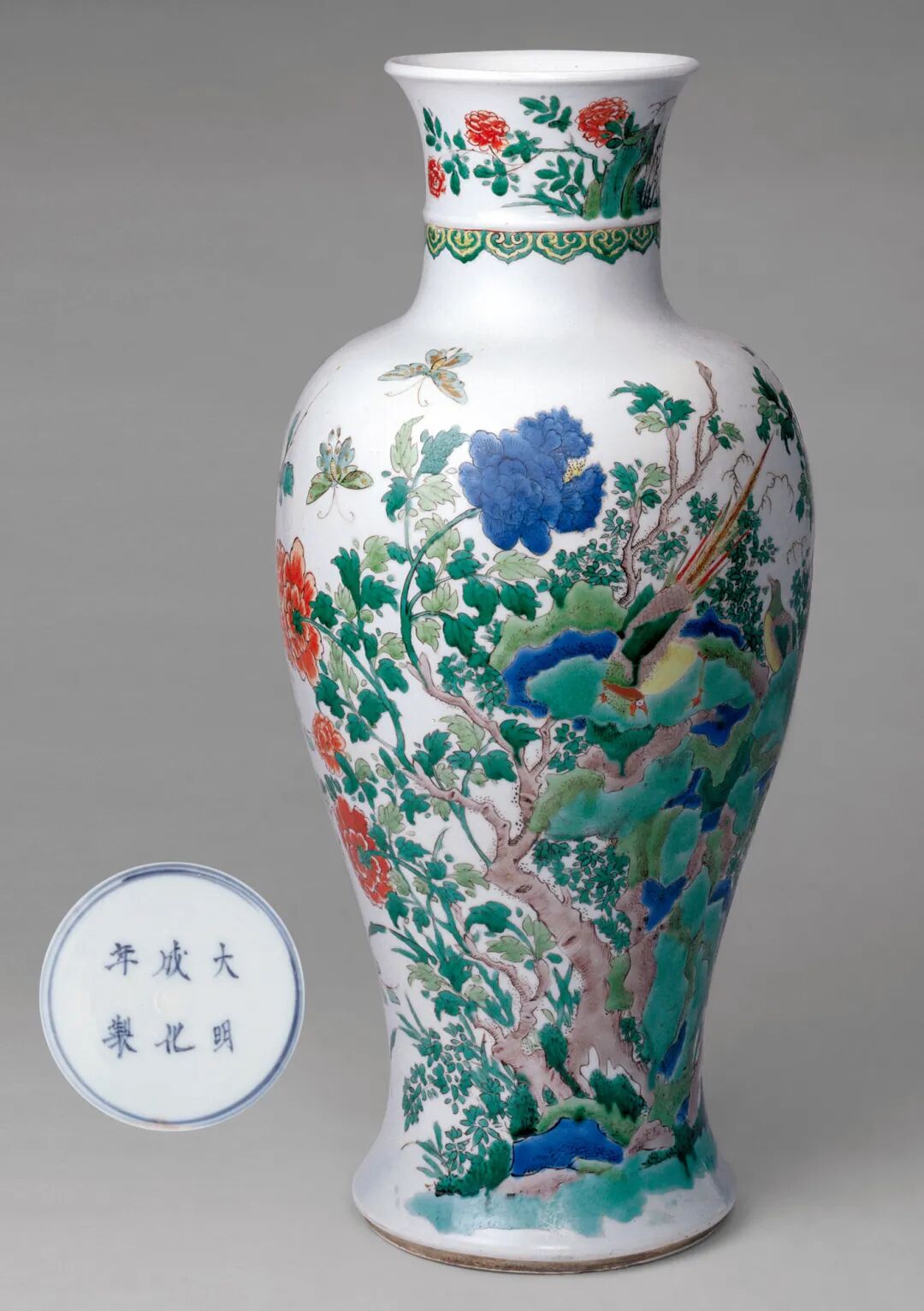 康熙五彩继承明代传统,在原有基础上新创了蓝彩、金彩和墨彩。明嘉靖时的五彩已经十分成熟,但尚没有发明蓝彩,所以画面中凡要用蓝色的地方都以青花替代。