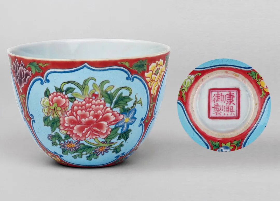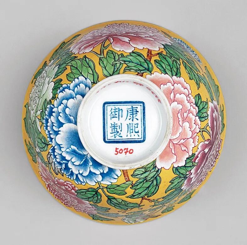 珐琅彩瓷器康熙时期多见有盘、碗、瓶等几款简单的造型,其胎体薄而半透明,彩料有微微凸起感,底款多见胭脂彩「康熙御制」四字篆书款。民国早期有非常相似的仿康熙珐琅彩碗、瓶、盘等,数量少而质量精。民国仿康熙珐琅彩很多,也十分到位,多数胎体较之康熙珐琅彩瓷器还要细白,但细白太过显得轻薄浮浅,绘画十分精致,款识照实物临摹,很难看出破绽。