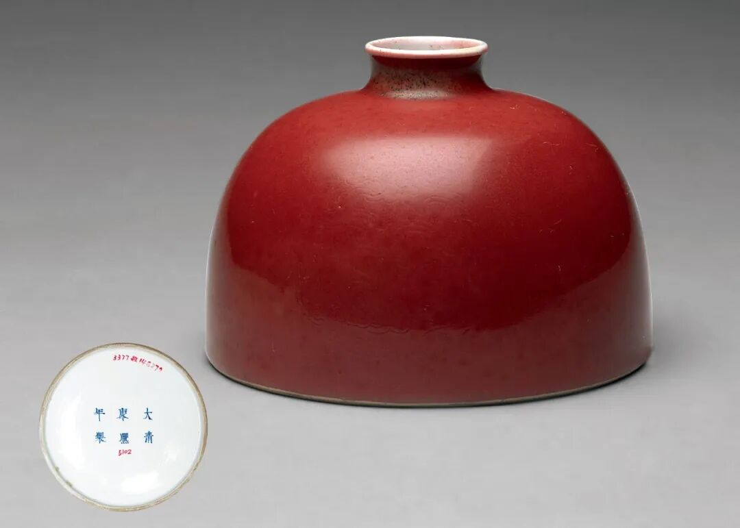 康熙豇豆红是康熙晚期出现的名贵御用釉,因烧造难度大而没有大件器物,也没有盘碗类器物,都是御用文房清供。豇豆红釉色淡红发粉还间杂自然形成的微小绿斑,犹如豇豆的红皮。