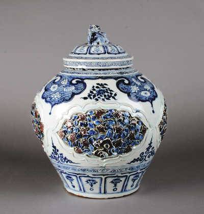类似的元代青花釉里红开光贴花盖罐器物在世界仅存4件,其中两件流失到国外。