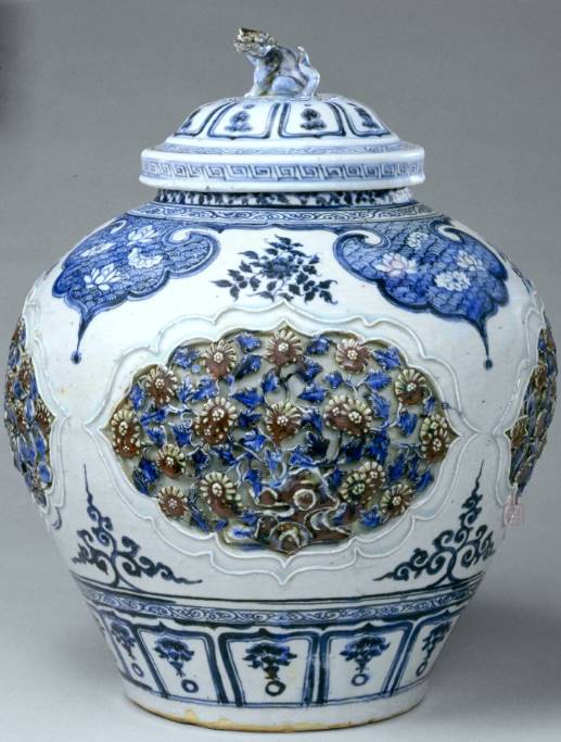 此罐属于大维德基金会,系上世纪30年代斐西瓦乐·大维德爵士从中国所购,使用了青花釉里红装饰。这种装饰风格在元朝时非常盛行,此罐是一个典型的范例。