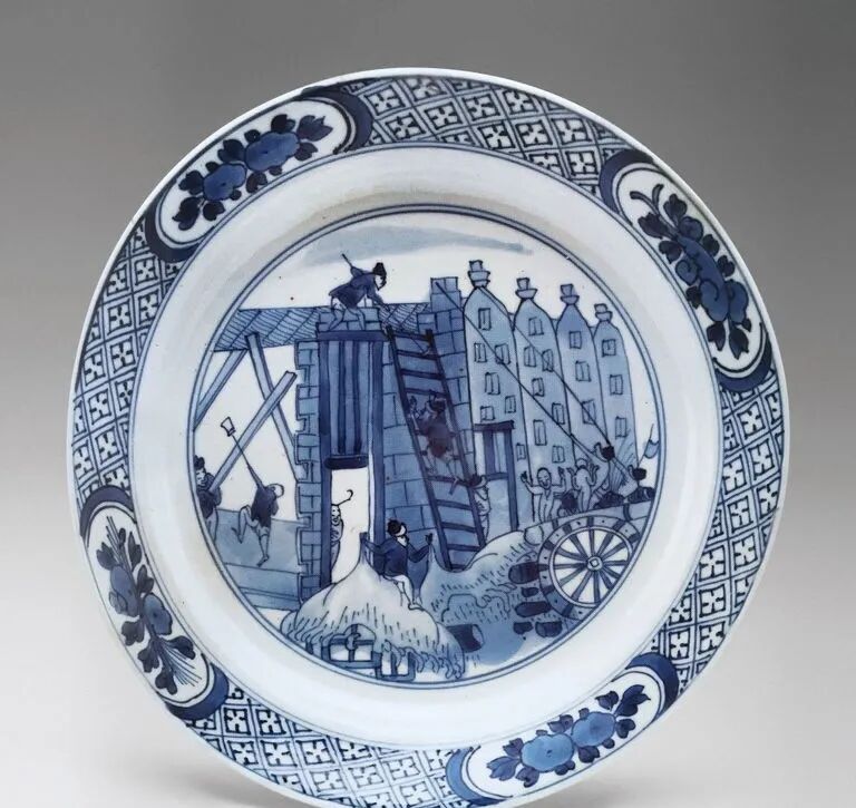 据说1690年荷兰鹿特丹爆发了起义,事件大致过程是某守卫与税吏起冲突,不小心致对方身死,法院盲目判处守卫死刑,从而激起百姓愤怒,推到了法院大楼。现藏于上海博物馆的一件清朝康熙年间的外销青花瓷,画面描绘的就是群众冲进法院时的情景。中国的青花配合西方的事件,称得上是中西合璧一次伟大的尝试。