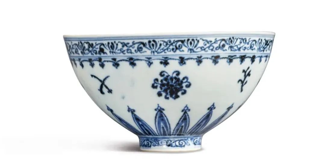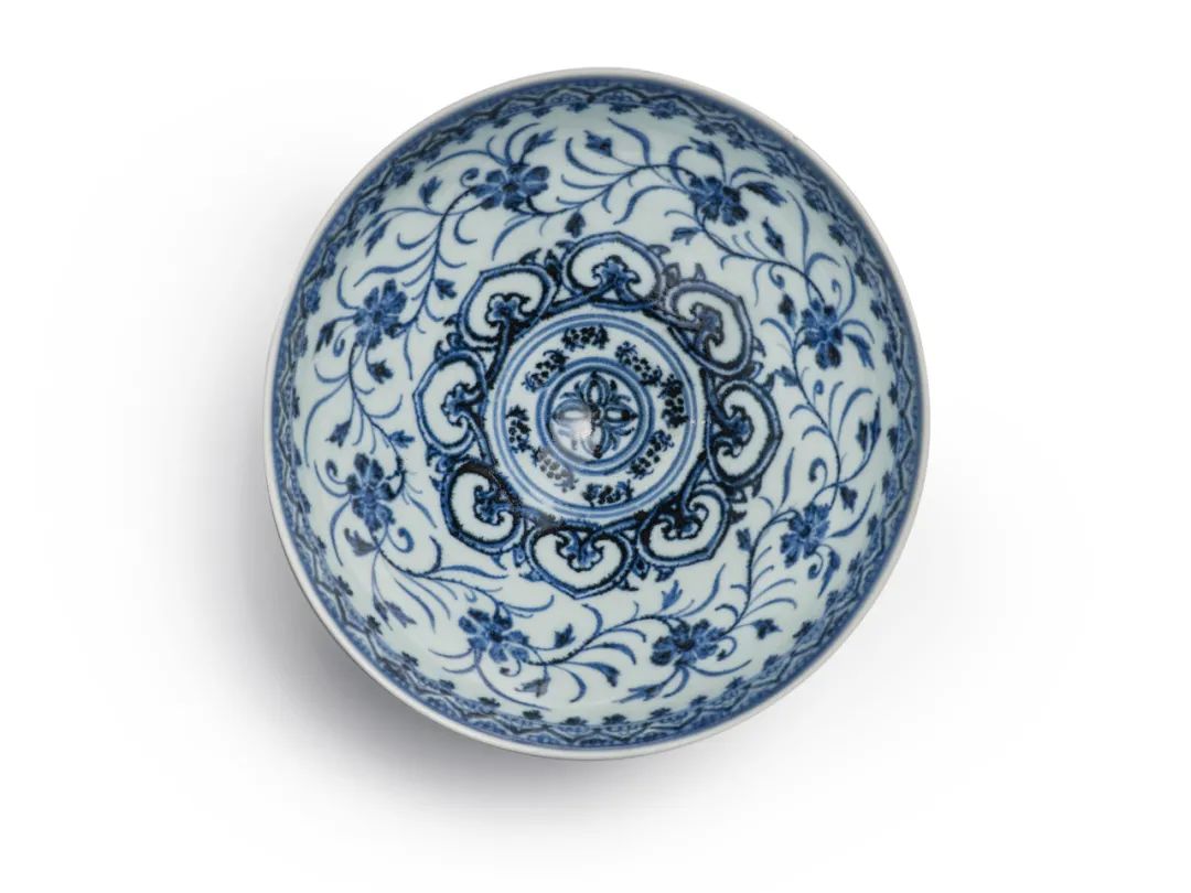 本盌无论器形、纹饰,皆属永乐经典、宫廷御制上乘,其抽象花卉纹饰有别于传统中国绘画之道,带有明显中东风格。一抹异域之风,极具特色,更显稀珍。