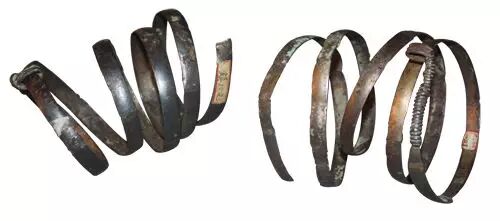 银缠钏 作多环连续的缠臂金。缠钏朝外一面呈弧形,头部用粗丝缠作活环与下层的连环套接,用来调节松紧。通体光素无纹。宽0.8厘米,厚0.1厘米(图15)。