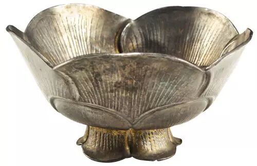 盏的样式延续宋代形制,如江苏溧阳平桥南宋银器窖藏出土的莲瓣形盏与此窖藏莲瓣形银盏相似。此类盏当为酒器,称为散盏。