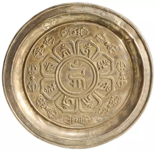 梵文银盘 高1.2厘米,口径16.8厘米,底径13.8厘米(图10)。形制同上。盘口沿刻一周回纹,盘内底及一周压印梵文,为六字真言的首字“嗡”,周围一圈为韦驮之降魔杵纹。