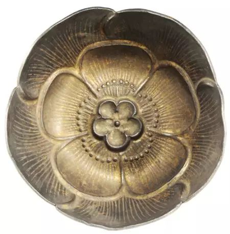 梅花形银盏 整器为梅花形,高4.5厘米,口径8.8厘米,底径3.9厘米(图6-1 图6-2)。五曲花口,腹部弧收,圈足较高,外撇,五曲梅花形足。盏壁压印两层梅花纹饰,内底印一朵梅花。