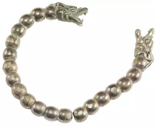 这种作串珠状的镯称“连珠镯”,是元代金银手镯的流行样式。连珠镯分空心和实心两种,此款为实心,模具成型,分量较重。