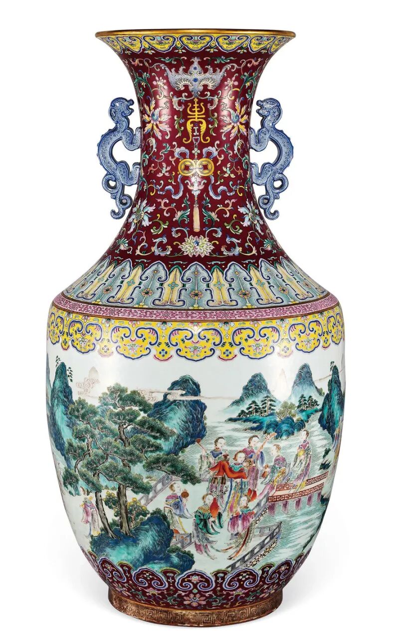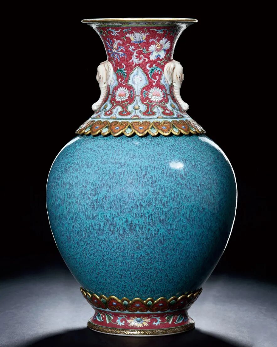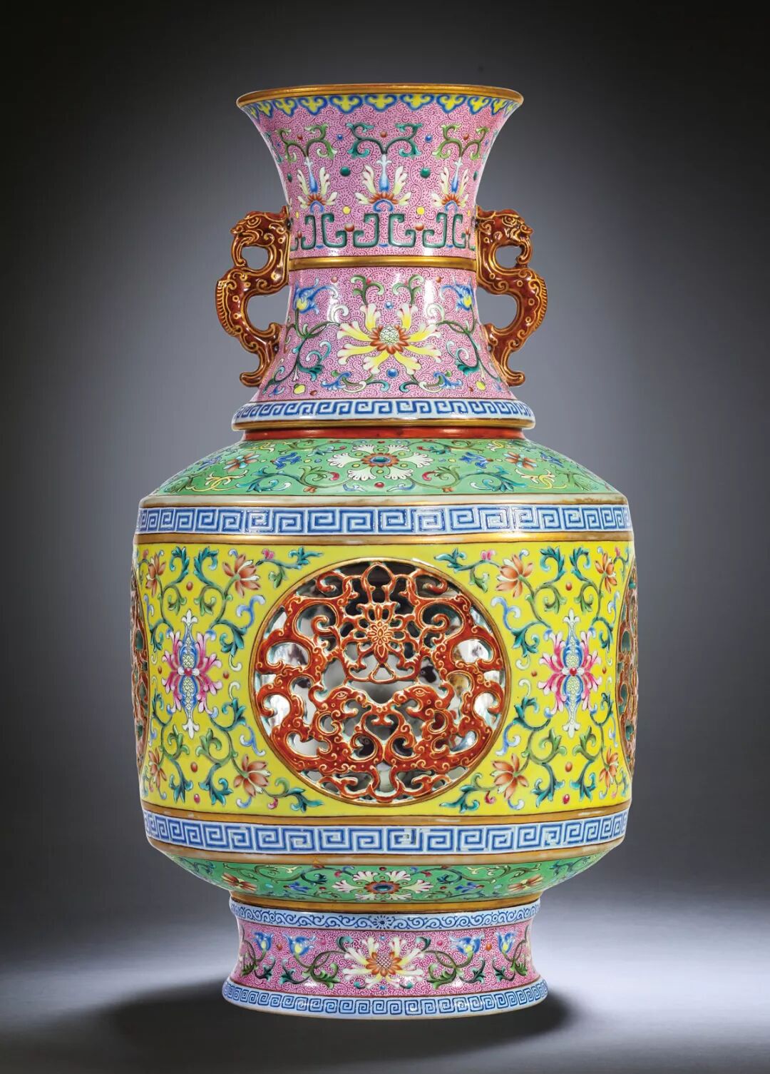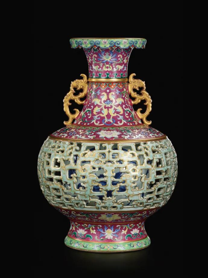 2021年在北京保利以2.65亿人民币成交的清乾隆御制洋彩胭脂红地轧道雕瓷镂空“有凤来仪百鸟朝凤”图双螭耳大转心瓶位居中国瓷器成交价之首,更刷新了全球最贵中国瓷器拍卖成交纪录!