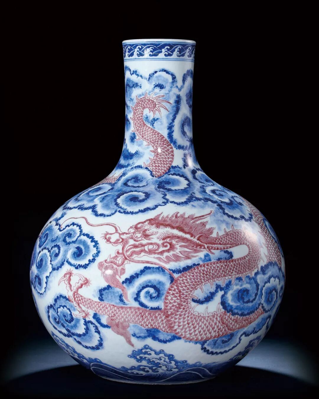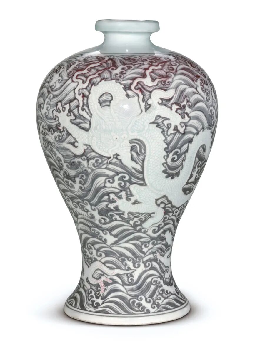 釉裡红海水锥拱苍龙教子图大梅瓶
